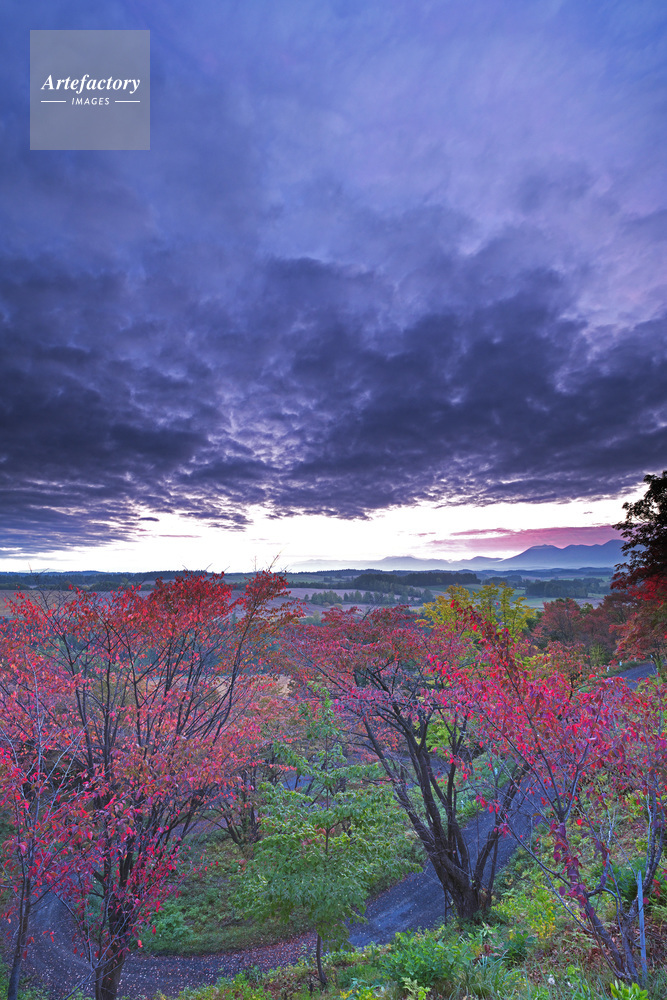 | 作品タイトル | 深山峠のさくら園の紅葉と十勝岳連峰(右)の朝 | モデルリリース | なし | |