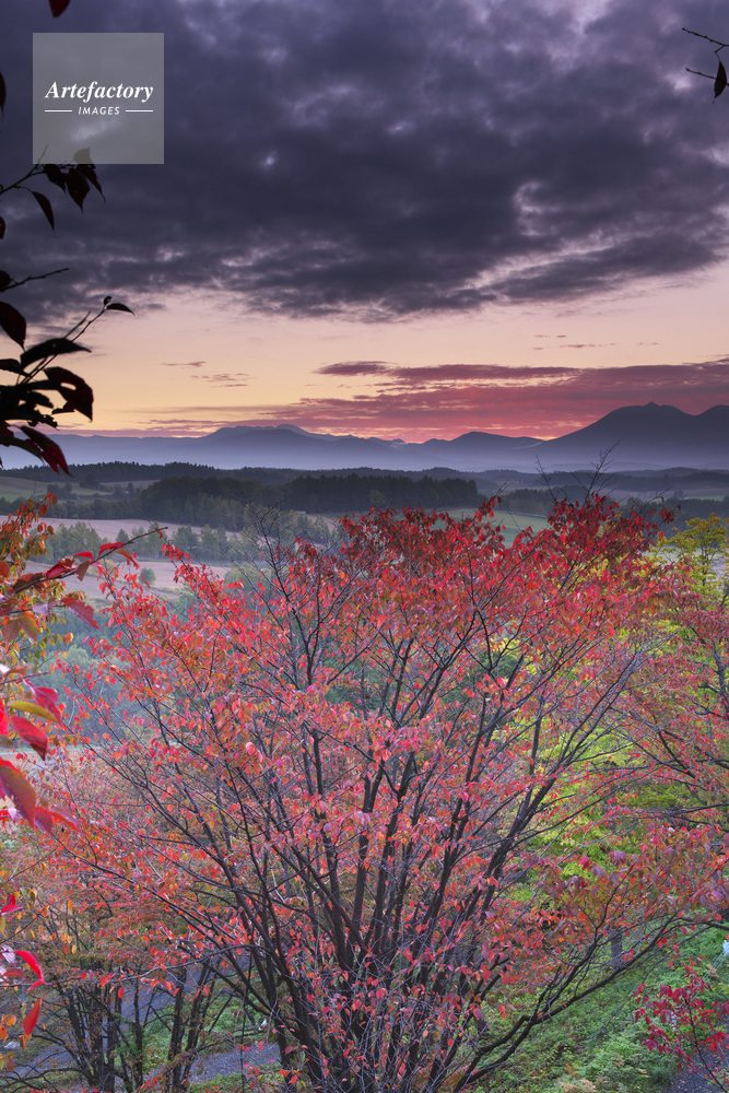 | 作品タイトル | 深山峠のさくら園の紅葉と十勝岳連峰(右)の朝 | モデルリリース | なし | |
