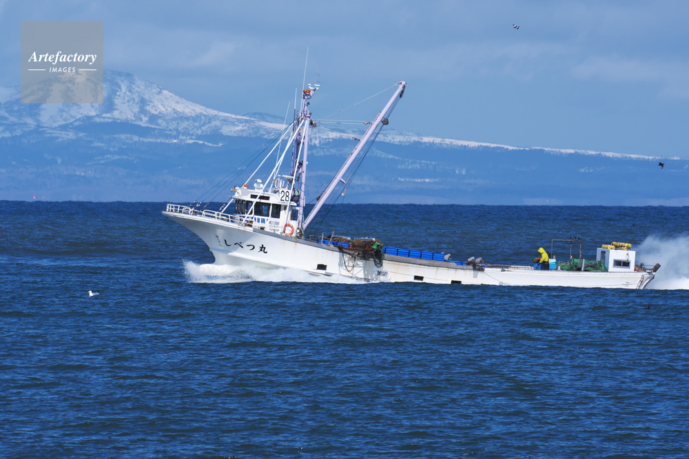 | 作品タイトル | 標津港に帰港するホタテ漁船と国後島 | モデルリリース | なし | |
