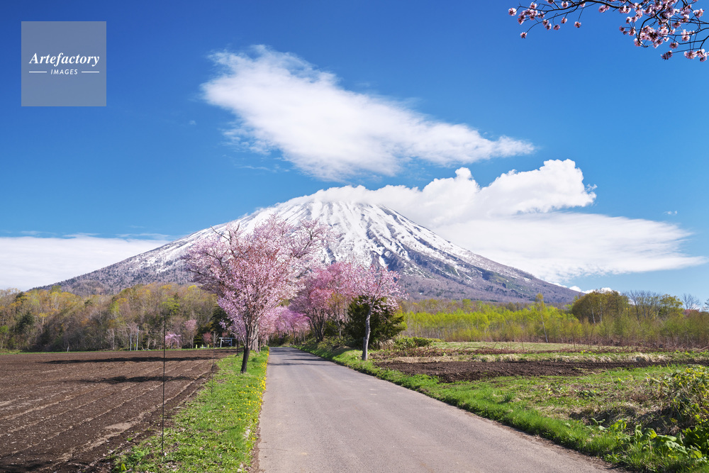 | 作品タイトル | 真狩神社の桜並木と羊蹄山 | モデルリリース | なし | |