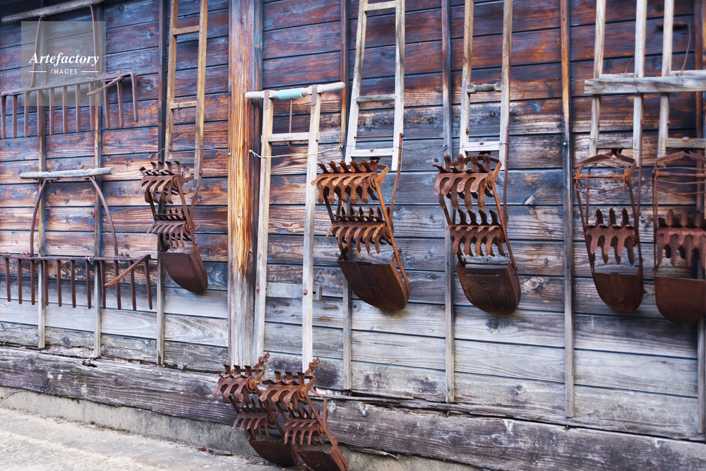 | 作品タイトル | 津軽伝承工芸館の外壁に飾られた農耕具 | モデルリリース | なし | |