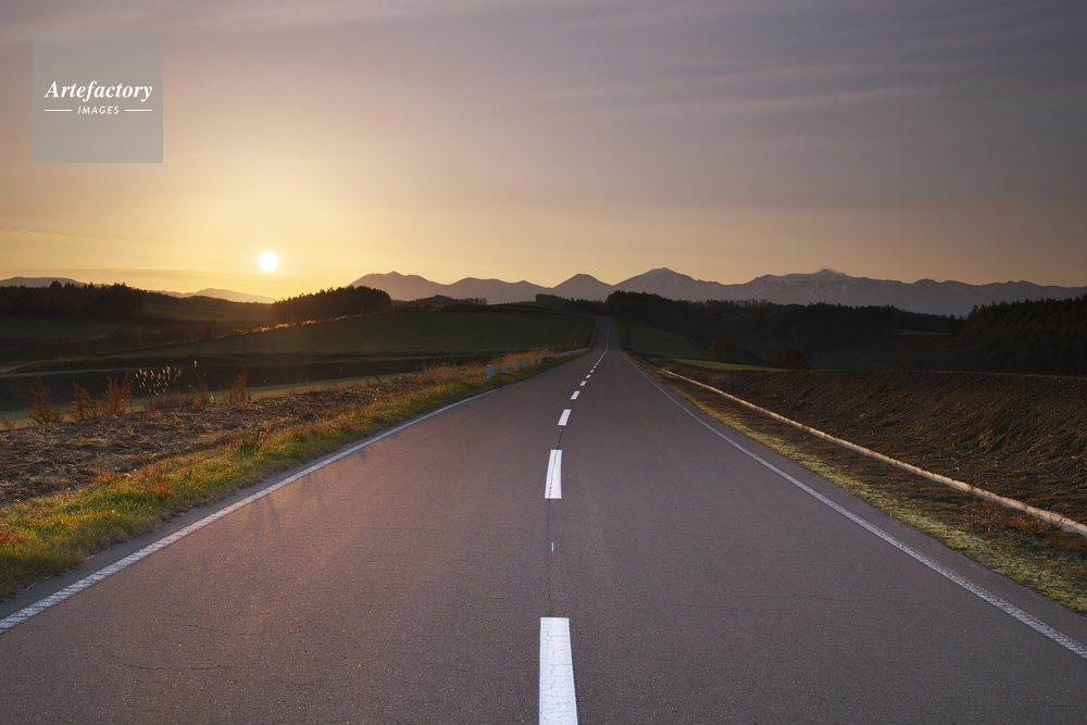 作品タイトル     十勝岳連峰と日の出と朝の道 モデルリリース なし