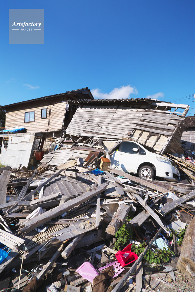 | 作品タイトル | 能登半島地震 倒壊した家屋と車 | モデルリリース | なし | |