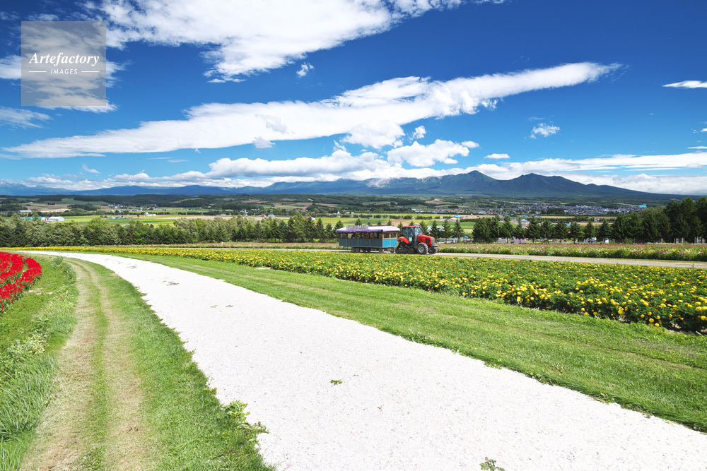 | 作品タイトル | フラワーランド ヘブンロード白い道と十勝岳連峰 | モデルリリース | なし | |