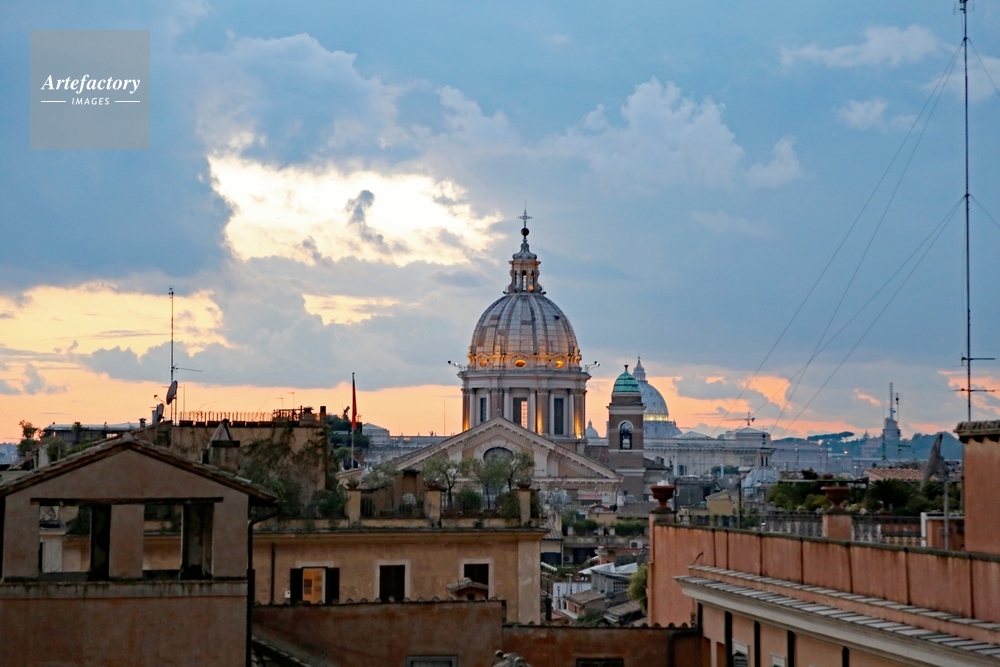 | 作品タイトル | スペイン階段上部から サンティ・アンブロージョ・エ・カルロ・アル・コルソ聖堂と街並みの夕景 | モデルリリース | なし | |