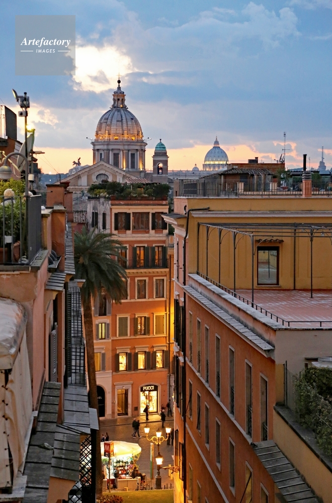 | 作品タイトル | スペイン階段上部から サンティ・アンブロージョ・エ・カルロ・アル・コルソ聖堂と街並みの夕景 | モデルリリース | なし | |