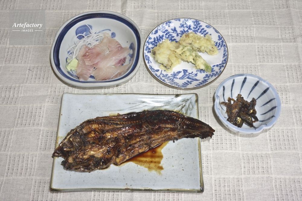 | 作品タイトル | 川魚料理、ナマズの蒲焼、コイの刺身、ナマズの天ぷら、モロコの甘露煮 | モデルリリース | なし | |
