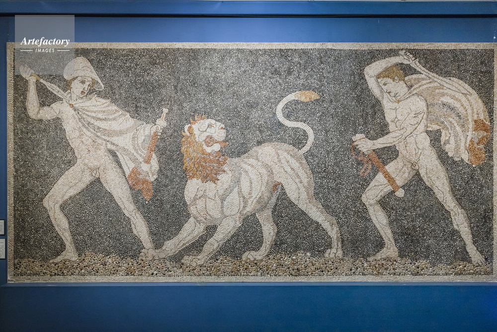 | キャプション | マケドニア地方 ペラ 考古学博物館 ライオン狩りのモザイク アレクサンドロス大王 | 制限事項 | ||