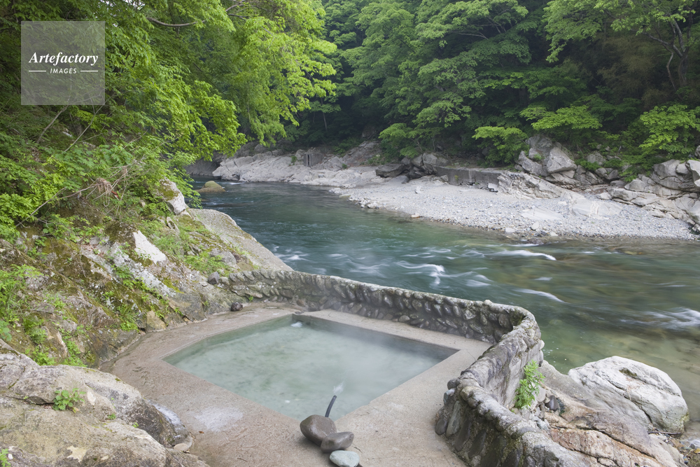 | 作品タイトル | 新緑の湯野上温泉の露天風呂と阿賀川 | モデルリリース | なし | |