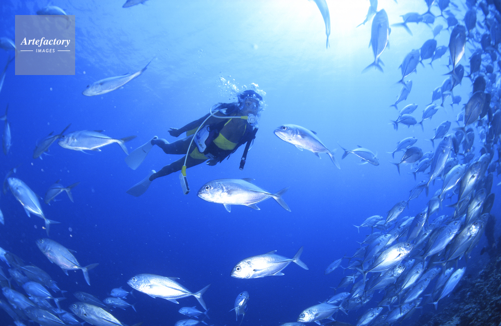| 作品タイトル | ギンガメアジの群とダイバーと太陽 | モデルリリース | あり | |
