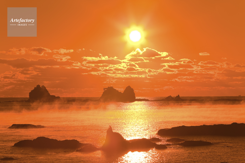 キャプション 太平洋 熊野灘 朝霧 岩 島 海 海岸 田原海岸 朝 ケアラシ 朝日 光芒 制限事項