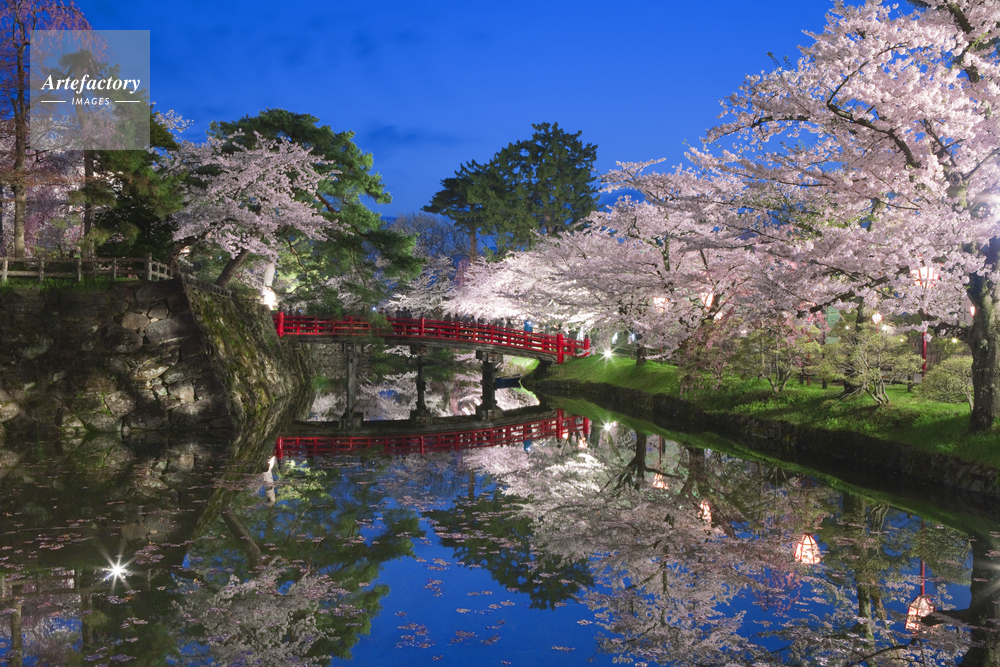 | キャプション | 堀 濠 橋 城 石垣 城壁 弘前公園 写りこみ 夕景 夜景 ボンボリ | 制限事項 | ||