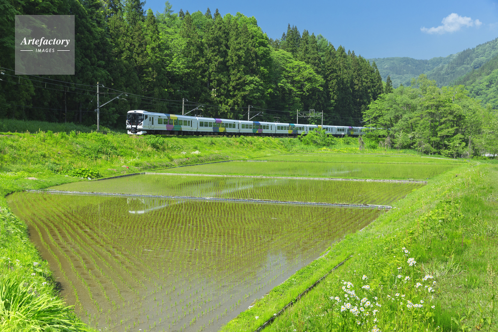 作品タイトル     新緑の電車と水田 モデルリリース なし