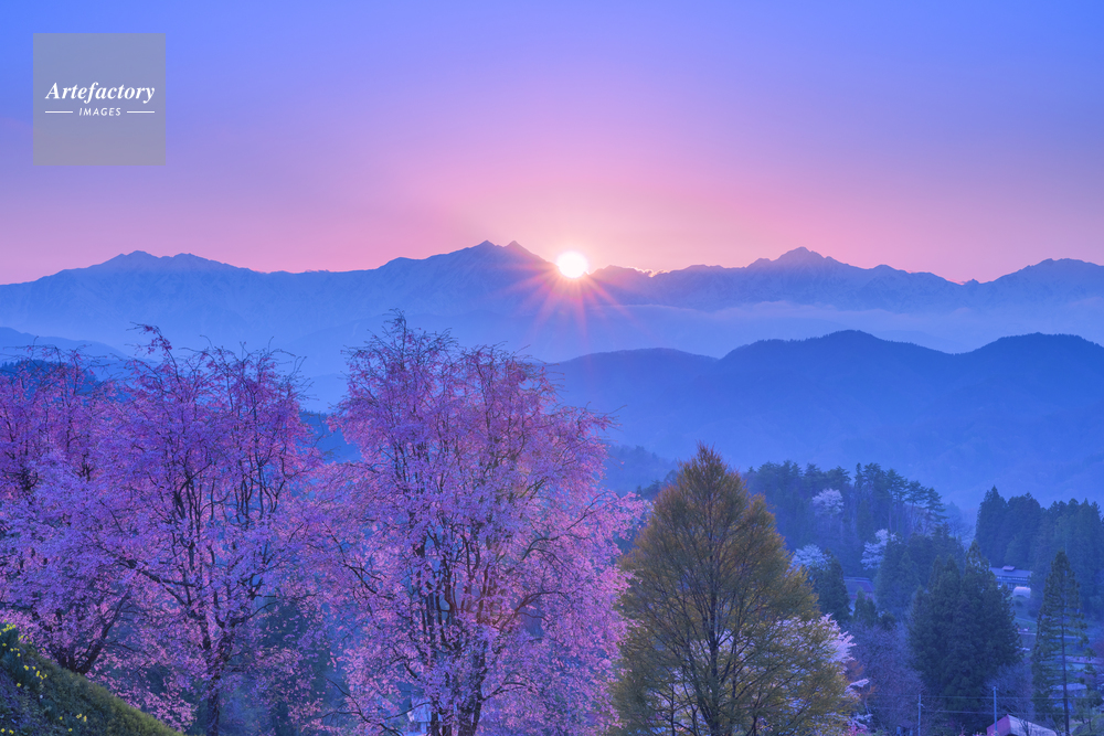 | 作品タイトル | 夕日に染まる小川村の桜と北アルプス | モデルリリース | なし | |