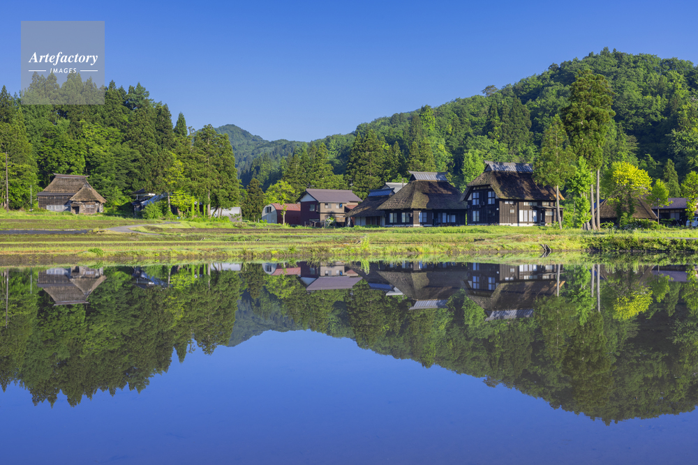| 作品タイトル | 新緑の荻ノ島かやぶきの里と水田 | モデルリリース | なし | |