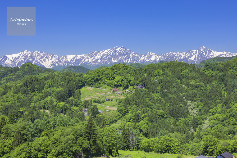| 作品タイトル | 新緑の北アルプスと集落 | モデルリリース | なし | |