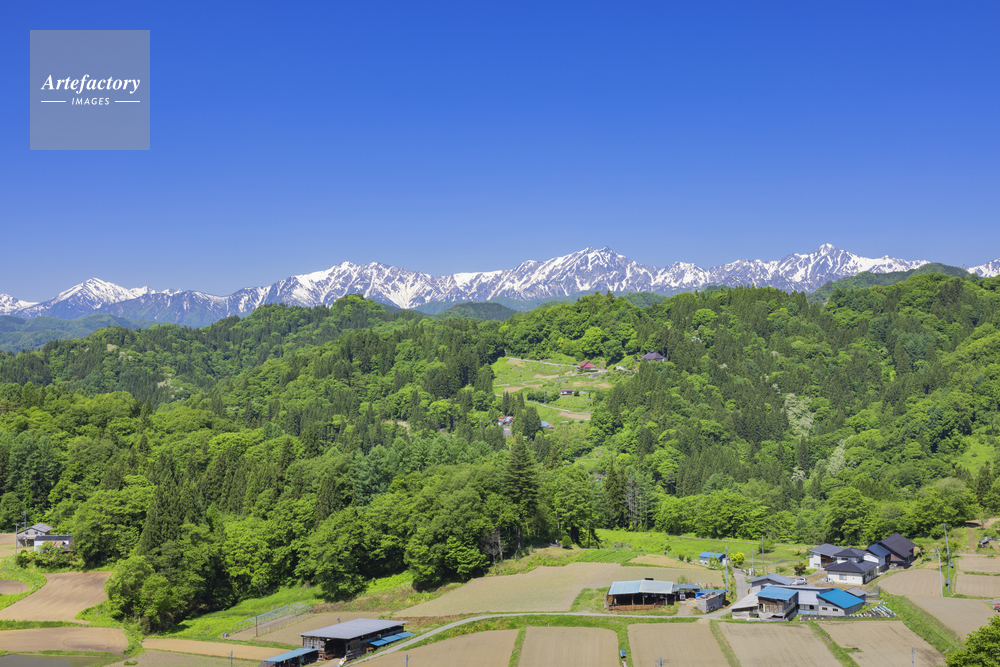 | 作品タイトル | 新緑の北アルプスと集落 | モデルリリース | なし | |