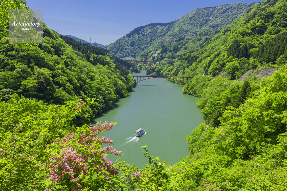 | 作品タイトル | ヤマウツギの花咲く庄川峡と観光船 | モデルリリース | なし | |