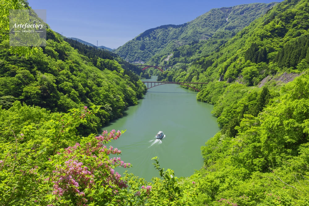 | 作品タイトル | ヤマウツギの花咲く庄川峡と観光船 | モデルリリース | なし | |