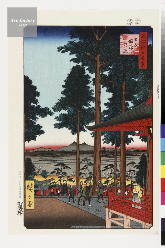 | キャプション | 浮世絵復刻版画 / 王子稲荷は江戸市中からは一日がかりで訪れる所であったが、関東の稲荷の総元締ということで参拝者は多かった。杉木立を通じて遠方に見えるのは筑波山である。 | 制限事項 | ||