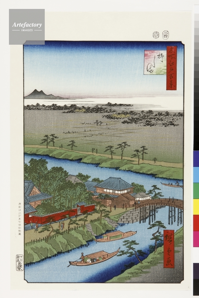 | キャプション | 浮世絵復刻版画 / 亀戸天神を北へ行くと横十間川(手前)と北十間川が交差し、柳島に出る。右側の柳島橋の袂には会席料理で有名な「橋本」があり、隣の赤い塀の妙見堂は芸人の信仰が厚く、参拝者が絶えなかったという。 | 制限事項 | ||