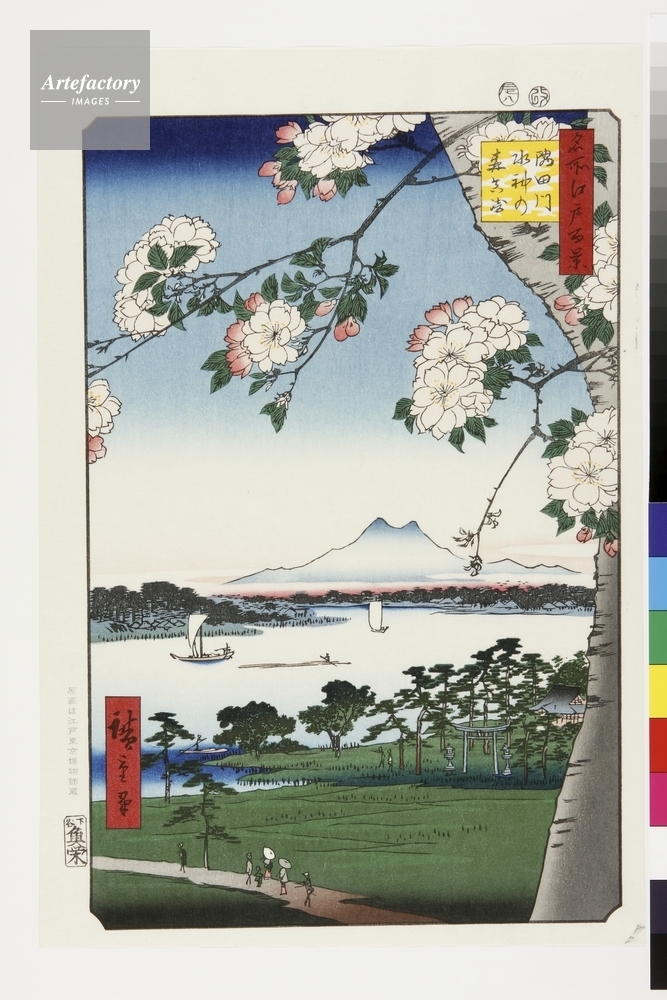 | キャプション | 浮世絵復刻版画 / 右端に描かれているのが隅田川の総鎮守といわれた水神社。この場所だけは洪水時でも浸水の被害が無く、水難、火難よけの神として厚い信仰をえていた。この辺りは江戸でも有数の景勝の地で、堤の桜越しの構図がよくその雰囲気をつたえている。 | 制限事項 | ||