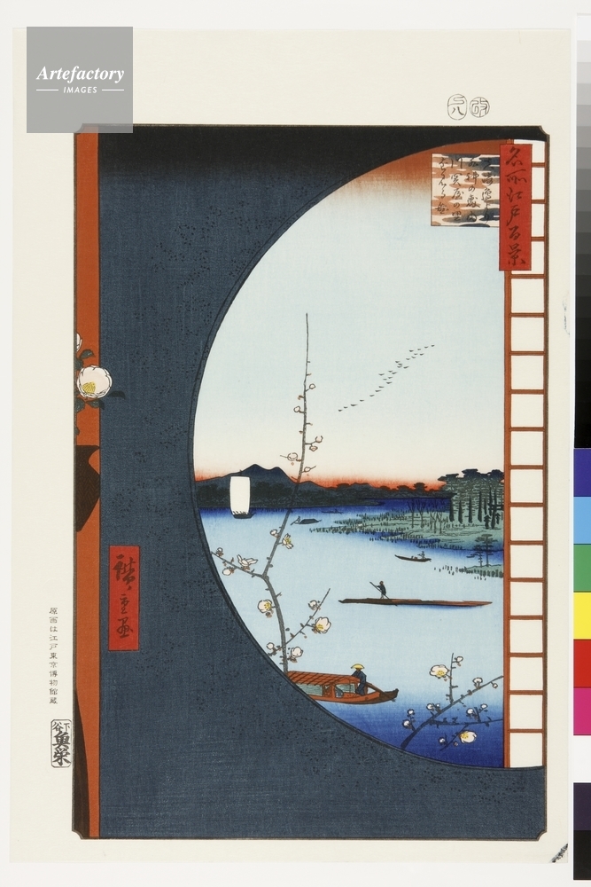 | キャプション | 浮世絵復刻版画 / 隅田川が南千住で大きくカーブした辺りに江戸でも有名な「真崎稲荷」がある。郊外で景勝の地である事から境内には料理屋が何軒も立並んだ。本図はその窓辺から景観を描いたものだが、斬新な構図は広重の非凡さ示したと言えよう。 | 制限事項 | ||
