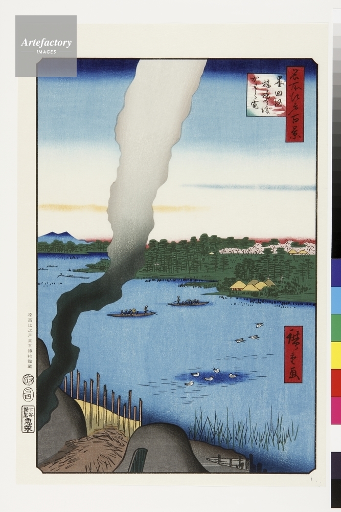 | キャプション | 浮世絵復刻版画 / 橋場の渡しは隅田川で最も古く、現在の白鬚橋付近にあった。浅草側には瓦等を作る今戸焼の竃が多く並んだ。火事が多かった江戸では、瓦が延焼を防ぐため、重要な仕事でもあった。火を使うため水辺で許可され、土を舟で運んでいたという。 | 制限事項 | ||