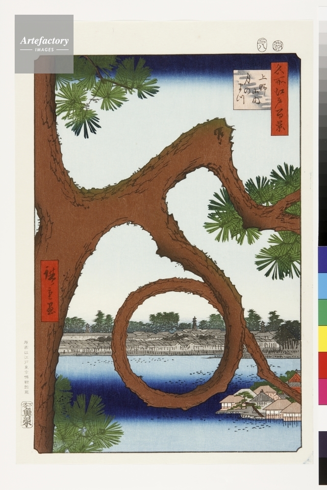 | キャプション | 浮世絵復刻版画 / 別画「上野清水堂不忍ノ池」には添景として描かれている「月の松」を主題にした作品。円を描く様にねじれた枝ぶりから付いた名前だが、人気のある松だった。手前が不忍池で対岸が池之端、本郷方面となる。 | 制限事項 | ||