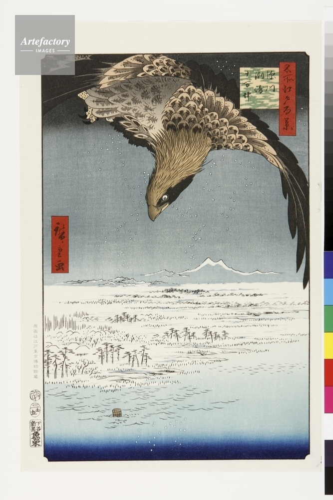 | キャプション | 浮世絵復刻版画 / 大鷲の眼下に広がる荒涼とした原野は遠浅の海を江戸のごみで埋め立てた造成地で、この図は現在の江東区東陽付近を描いたもの。不毛の土地を勇壮な大鷲で表現している。小面積だが鷲の爪は純黒を再現する「膠摺」が用いられている。 | 制限事項 | ||