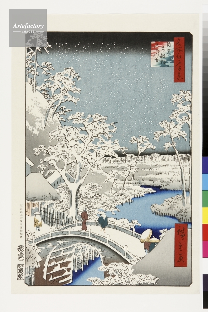 | キャプション | 浮世絵復刻版画 / 現在の目黒行人坂のある台地一帯は、夕日が美しく見えたので「夕日の岡」と呼ばれていた。その台地の袂、目黒川に架かるのが石造りの「太鼓橋」である。雪景色を得意とした広重の作品の中でも素晴らしい出来映えの一つである。 | 制限事項 | ||