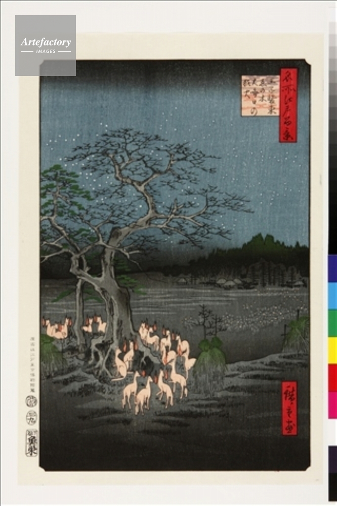 | キャプション | 浮世絵復刻版画 / 王子稲荷は関東の稲荷の総元締め。大晦日の夜に関東中の狐が集まり装束を改め、正月の挨拶として王子稲荷に参籠したという伝承を描いている。人々はその狐火の数で豊作を占ったという。暗闇で「雲母摺り」の効果がよく表れている。 | 制限事項 | ||