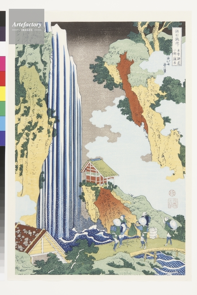 | キャプション | 浮世絵復刻版画 / 中山道(木曽街道)・木曾路にある小野の瀧は現在も豊富な水量をみせる名瀑。瀧を左に寄せ、奥行きが出た事で名状し難い雰囲気が漂う。落下する水、うねる水、ゆるやかに流れる水とを描き分ける北斎の観察力の確かさが窺える。 | 制限事項 | ||