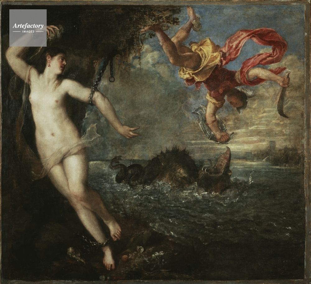 | キャプション | Andromeda is depicted nude, chained to a rock wearing a garnet ear-ring; by her feet lie growths of coral and the skull of a large bird. Perseus, at the upper right, wears a red cloak, crimson cuirass and yellow tunic. Below him is the sea monster. | 制限事項 | ||