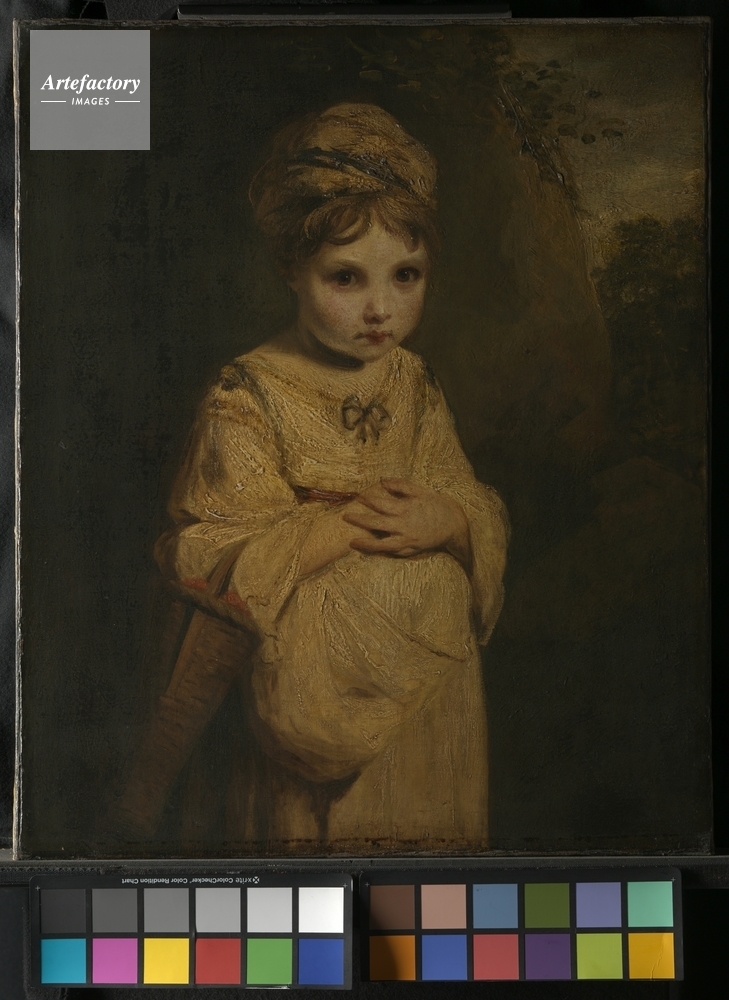 | キャプション | A little girl, shown three-quarter length, with chestnut hair and brown eyes, wearing a cream head-dress and a dress with a red sash and a black bow. She is carrying a basket of strawberries over her right arm. | 制限事項 | ||