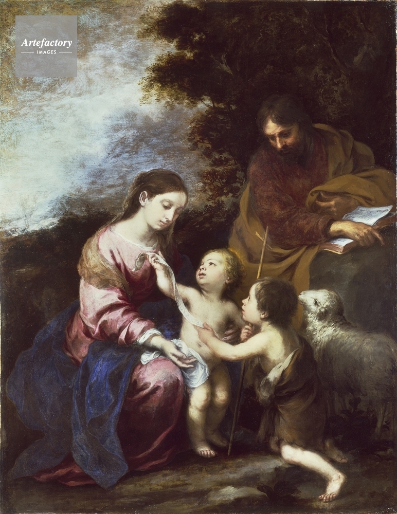 | キャプション | The Holy Family with the infant Christ holding up a scroll. The Virgin Mary, dressed in purple with a blue drape, kneels to his left, while Joseph and the infant John the Baptist sit to his right with a lamb. | 制限事項 | ||