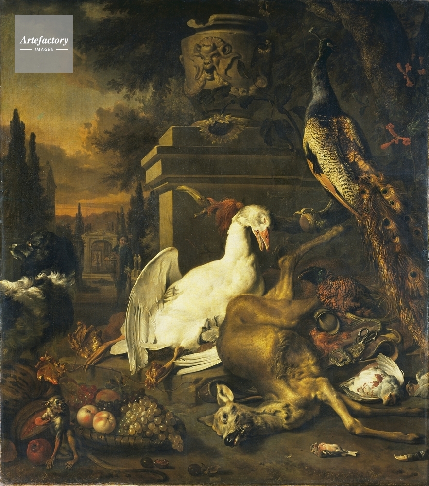 | キャプション | A peacock and a dog standing guard over a dead roe, partridge and pheasant, while a monkey steals fruit from a bowl containing grapes, plums and quinces in the left forground. | 制限事項 | ||