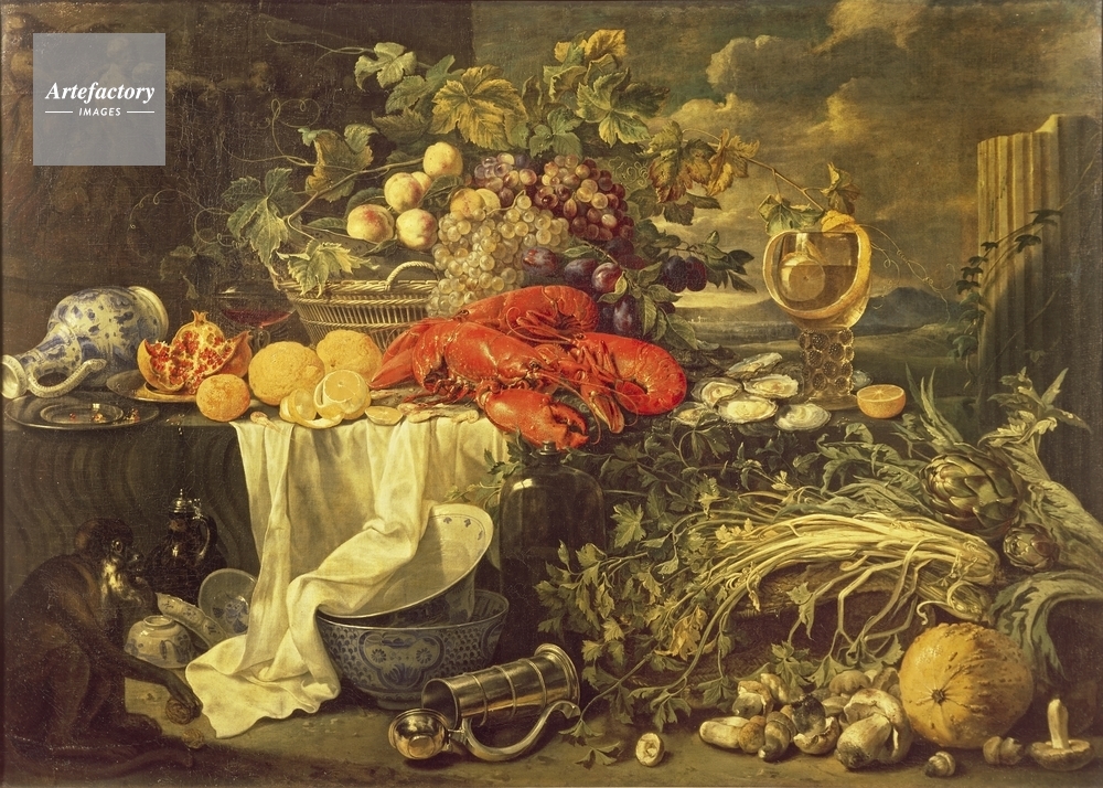 | キャプション | An arrangement of a bellarmine, red lobster, fruit in a basket, a range of ceramics Chinese porcelain bowls, glass goblet, silver tankard, vegetables, shells, and a monkey on the left in front of a Classical sculpture. | 制限事項 | ||