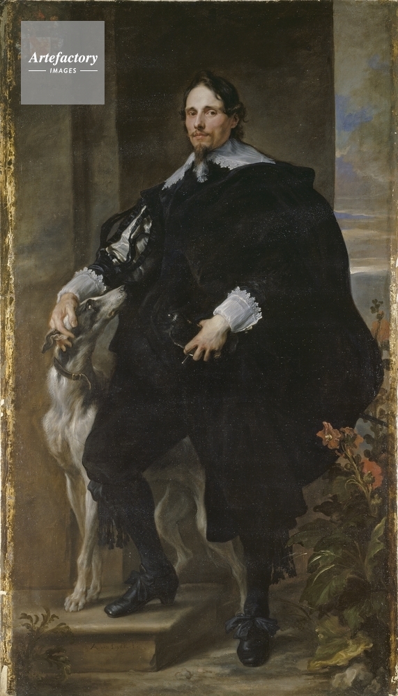 | キャプション | Pendant to P79. Full-length portrait of Philippe Le Roy (1596-1679) with his dog. He is dressed in black with white lace decorating the cuffs and collars. His coat of arms is on the top left. A cloudy landscape is visible on the background right. | 制限事項 | ||