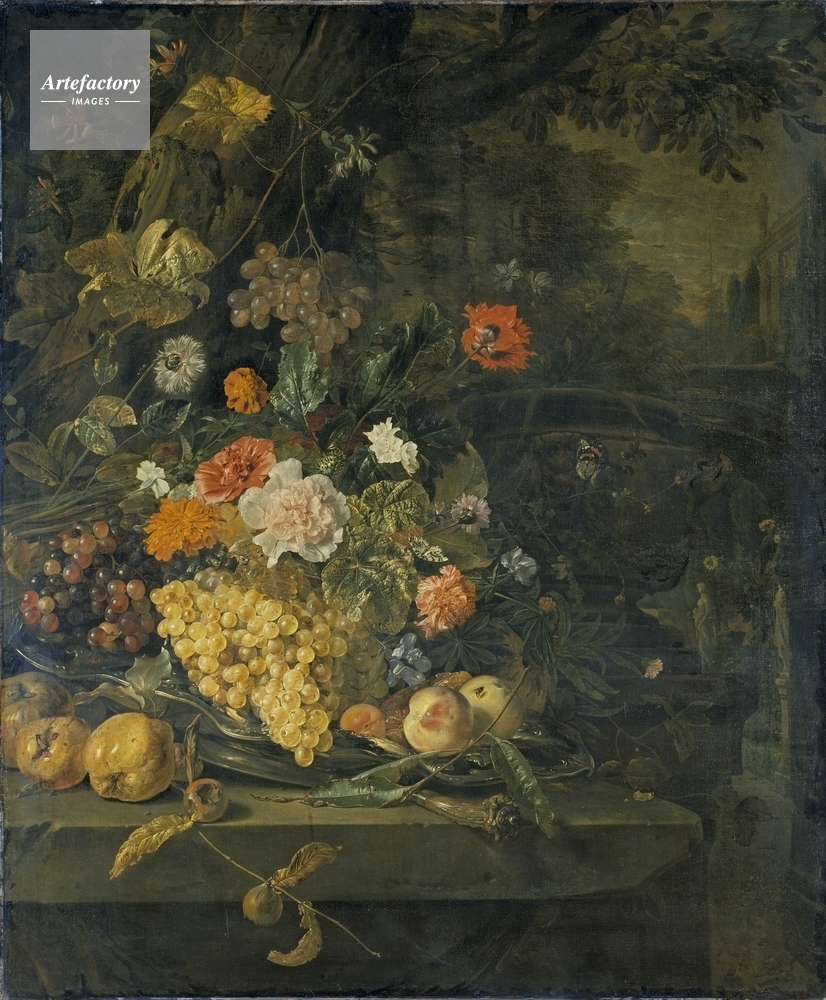 | キャプション | A silver dish with grapes, a pear, a peach and a pomegranite, and flowers above including roses, poppies, honeysuckle and a sunflower, with two butterflies. Signed, bottom centre. | 制限事項 | ||