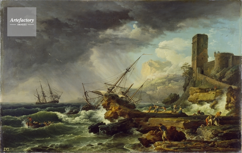 | キャプション | Depicting a stormy coastline with a shipwreck. In the background on the right is a path to a castle on which a crowd of people are gathered. On the rocky foreground is a lady being carried by two men. A small boat with figures can be seen to the left. | 制限事項 | ||