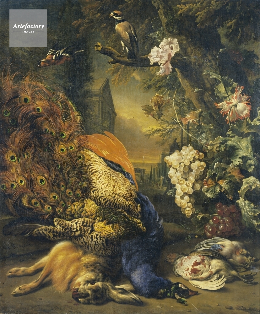 | キャプション | A dead peacock, hare and game, including a ringed plover, a jay and a partridge, with poppies and grapes to the right. Signed, upper left. | 制限事項 | ||