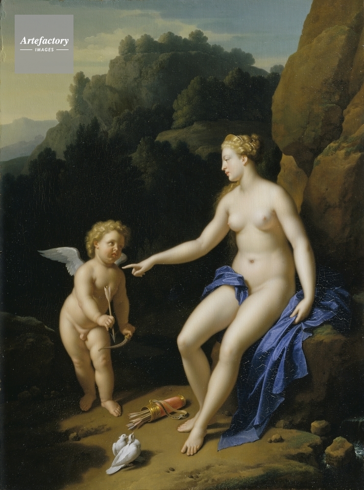 | キャプション | Venus and Cupid in a rocky landscape; Venus is seated on a blue drapery, with pearls and a gold filet in her blond hair, and a pink quiver of arrows at her feet. Cupid stands to her left, and running water is visible to the bottom right. | 制限事項 | ||