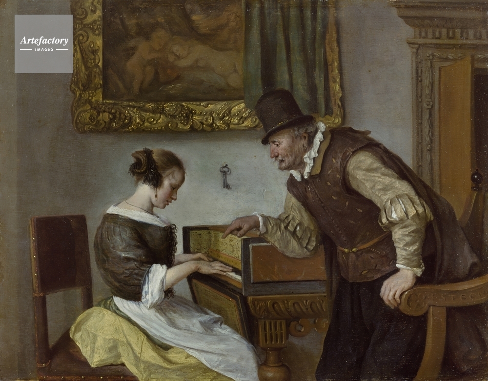 | キャプション | An old man teaching a young woman the harpsichord, he peers and points at the girl who sits upright. In the background hangs a painting of Venus and Cupid asleep, indicating the humorous erotic tone of the foreground scene. | 制限事項 | ||