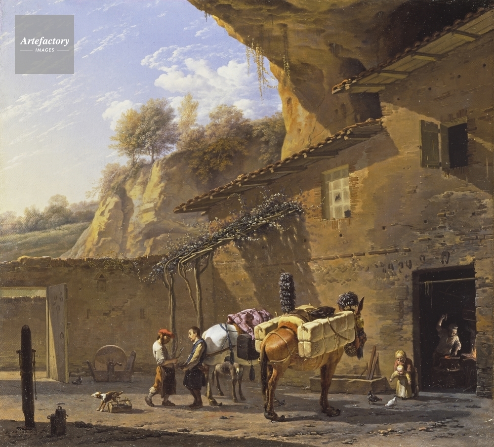 | キャプション | A smithy in an Italianate setting. On the right two men, a woman, a child and two mules. The white mule has a purple saddle cloth, and the brown mule has fly-whisks on its head and is saddled. | 制限事項 | ||