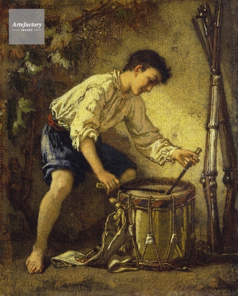 | キャプション | A young drummer boy playing a yellow drum with a red and black striped rim. He wears a white shirt and blue breeches. Signed T.C. centre right. | 制限事項 | ||