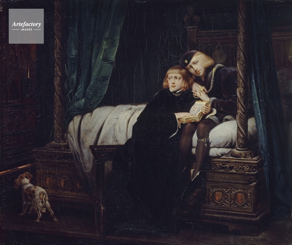 | キャプション | A scene based on Shakespeare's 'Richard III', IV, iii. The fair-haired Edward V and the auburn-haired Duke of York in the Tower of London. They sit on a bed with green curtains. A dog is on the left. The shadow of an approaching murderer under the door. | 制限事項 | ||