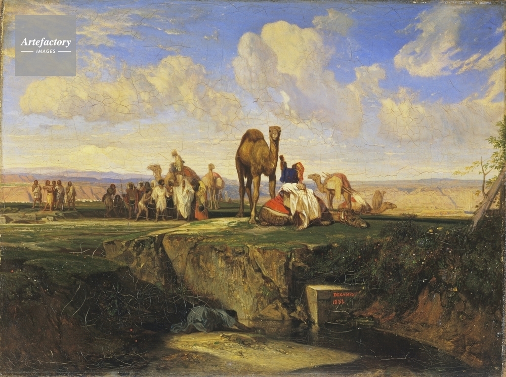 | キャプション | Joseph sold by his brothers (Genesis XXXVII, 25-8). He is in white with his eleven brothers, camels and seven merchants.'DECAMPS. / 1838.' signed in red on the stone in centre right. | 制限事項 | ||