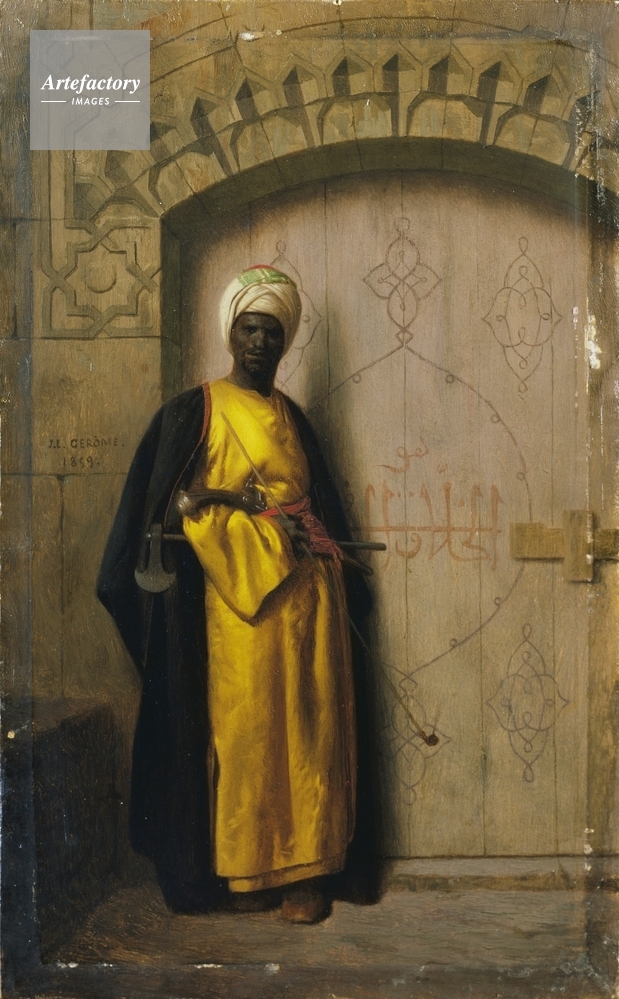 キャプション Full-length figure of a guard of the Harem standing by a doorway. He wears a white turban, and a black cloak over a yellow caftan. 制限事項