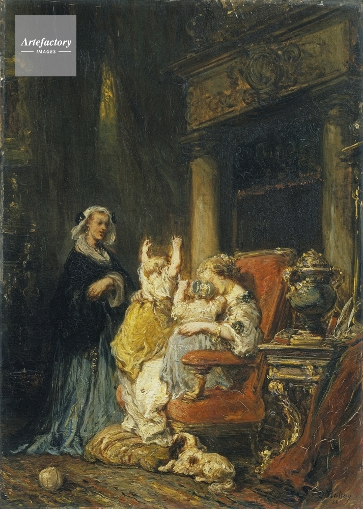| キャプション | A mother and her children in a seventeenth-century interior, the mother dressed in white and the children in yellow and blue. A maid stands next to them in blue with a black shawl. | 制限事項 | ||